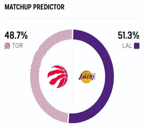 这是两队本赛季的第二次交锋,上一场交手,湖人队以3分之差险胜猛龙。赛前,美媒ESPN对本场比赛进行了胜率预测,湖人胜率为51.3% ,稍占优势,猛龙队胜率则仅有48.7%。
